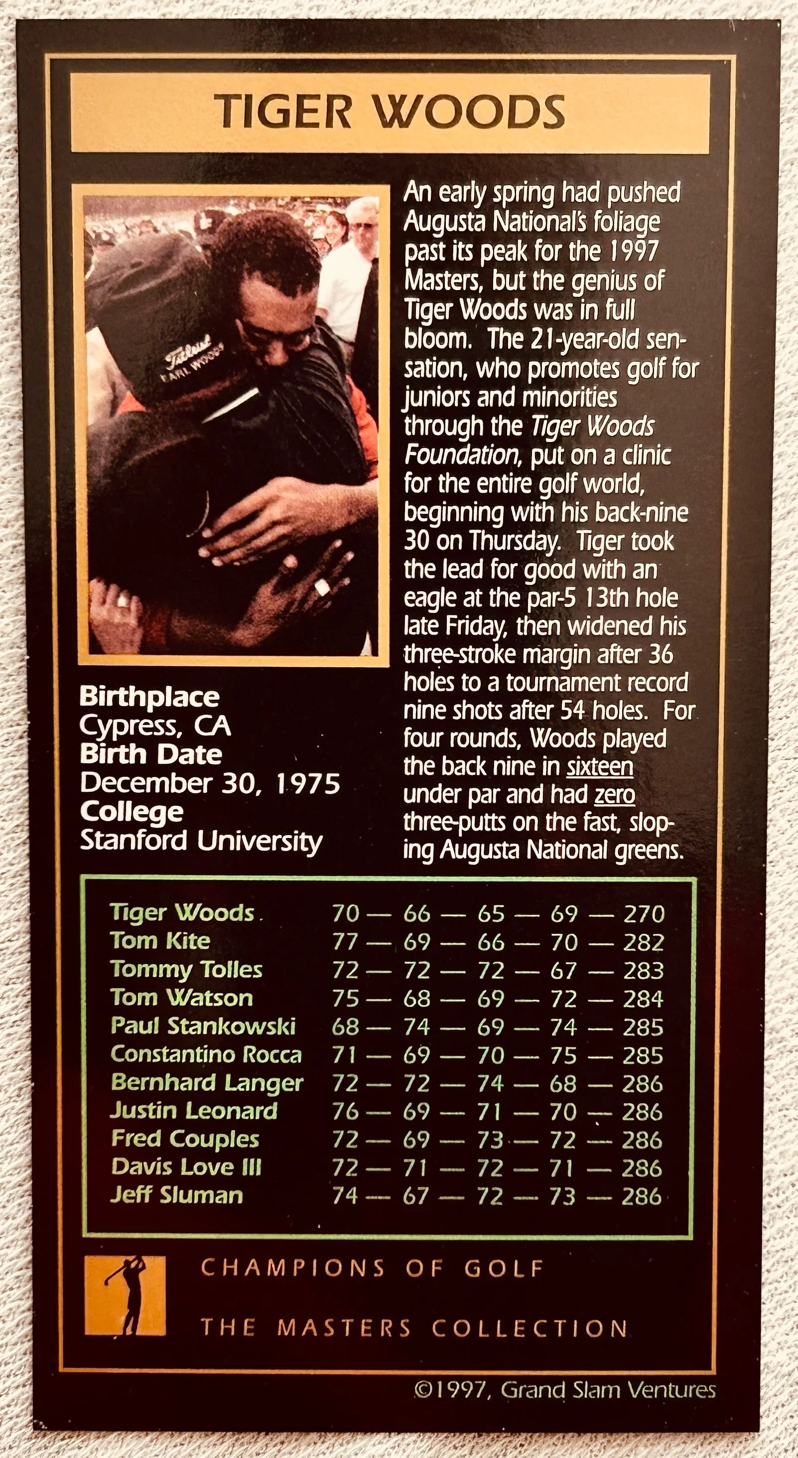 Complete set of 1997 Grand Slam Masters Champion black golf cards, 62 total including one card for each champion from 1997 Tiger Woods to 1934 Horton Smith, and all the other greats who won the fabled green jacket in between. This means the set includes 6 Jack Nicklaus cards, 4 Arnold Palmer cards, plus Gene Sarazen, 2 Byron Nelson cards, 3 Sam Snead cards, 2 Ben Hogan cards, 3 Gary Player cards, 2 Seve Ballesteros cards etc.