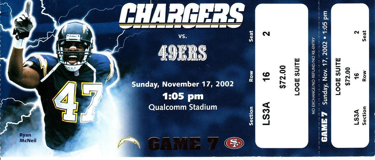 Full unused ticket to the Nov. 17, 2002 San Francisco 49ers at San Diego Chargers game. The Chargers prevailed in a 20-17 overtime thriller (although the 49ers went on to win the NFC West Division). Drew Brees, in his first season as a starter, set career highs in passing attempts (50), completions (29) and passing yards (336) that he surpassed later. Has minor to moderate flaws. ONLY ONE LEFT.