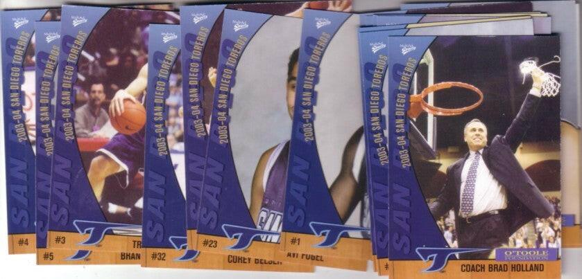Almost complete (missing one card, 17/18 included) set of 2003-04 University of San Diego Toreros basketball cards produced by MultiAd sports, including head coach Brad Holland and a special 2002-03 West Coast Conference Champions NCAA Tournament card. NrMt-Mt or better. ONLY ONE AVAILABLE FOR SALE.