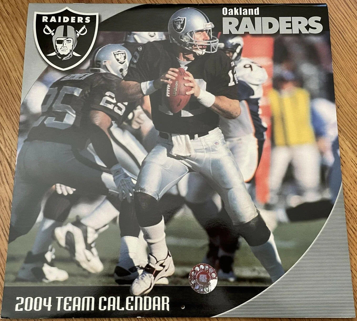 2004 Oakland Raiders 12 by 12 inch wall calendar featuring Rich Gannon on the cover. THE TIM BROWN PAGE HAS BEEN REMOVED, calendar otherwise has only minor handling flaws and wear. Other featured players include Jerry Rice, Charles Woodson and Rod Woodson. ONLY ONE AVAILABLE FOR SALE.