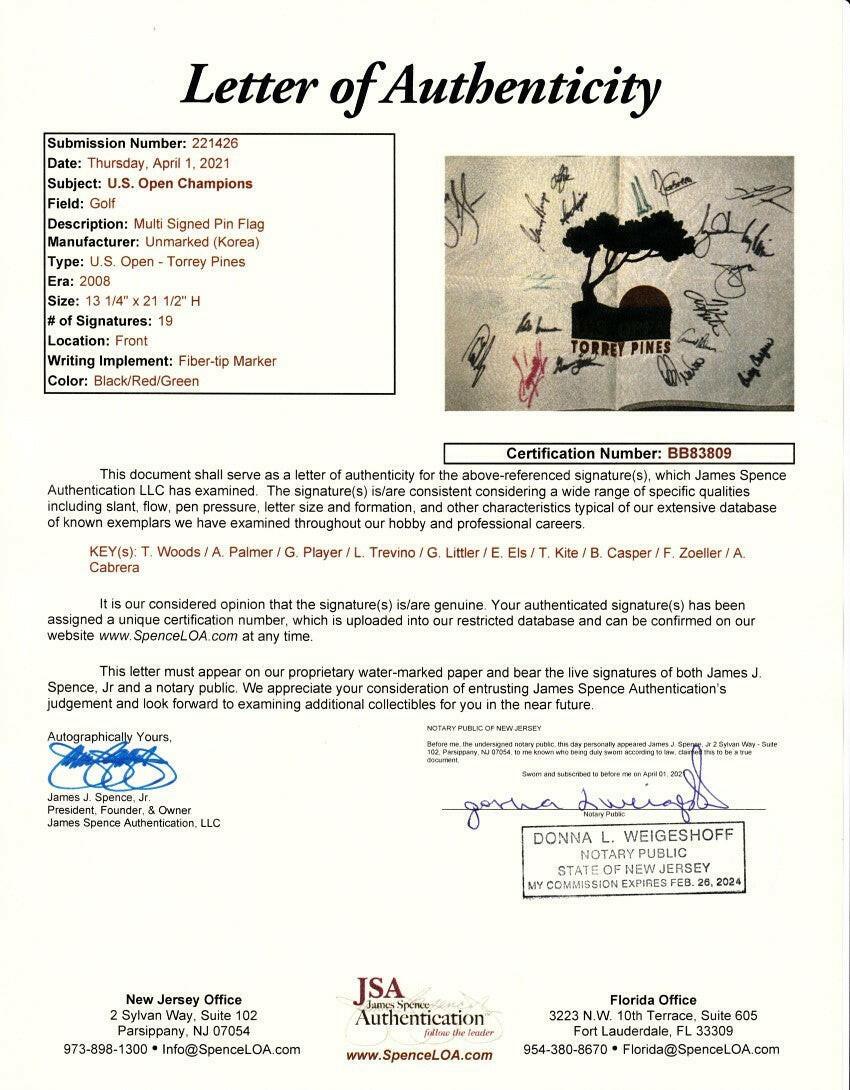2008 US Open embroidered flag autographed in various pens by 19 winners of this major tournament: Tiger Woods (won his 14th major title at this event), Angel Cabrera, Billy Casper, Ernie Els, Jim Furyk, Lucas Glover, Hubert Green, Hale Irwin, Lee Janzen, Tom Kite, Gene Littler, Larry Nelson, Arnold Palmer, Corey Pavin, Gary Player, Scott Simpson, Curtis Strange, Lee Trevino and Fuzzy Zoeller. All autographs obtained in person. Authenticated by JSA with their matching numbered sticker on the flag and Letter of authenticity.
