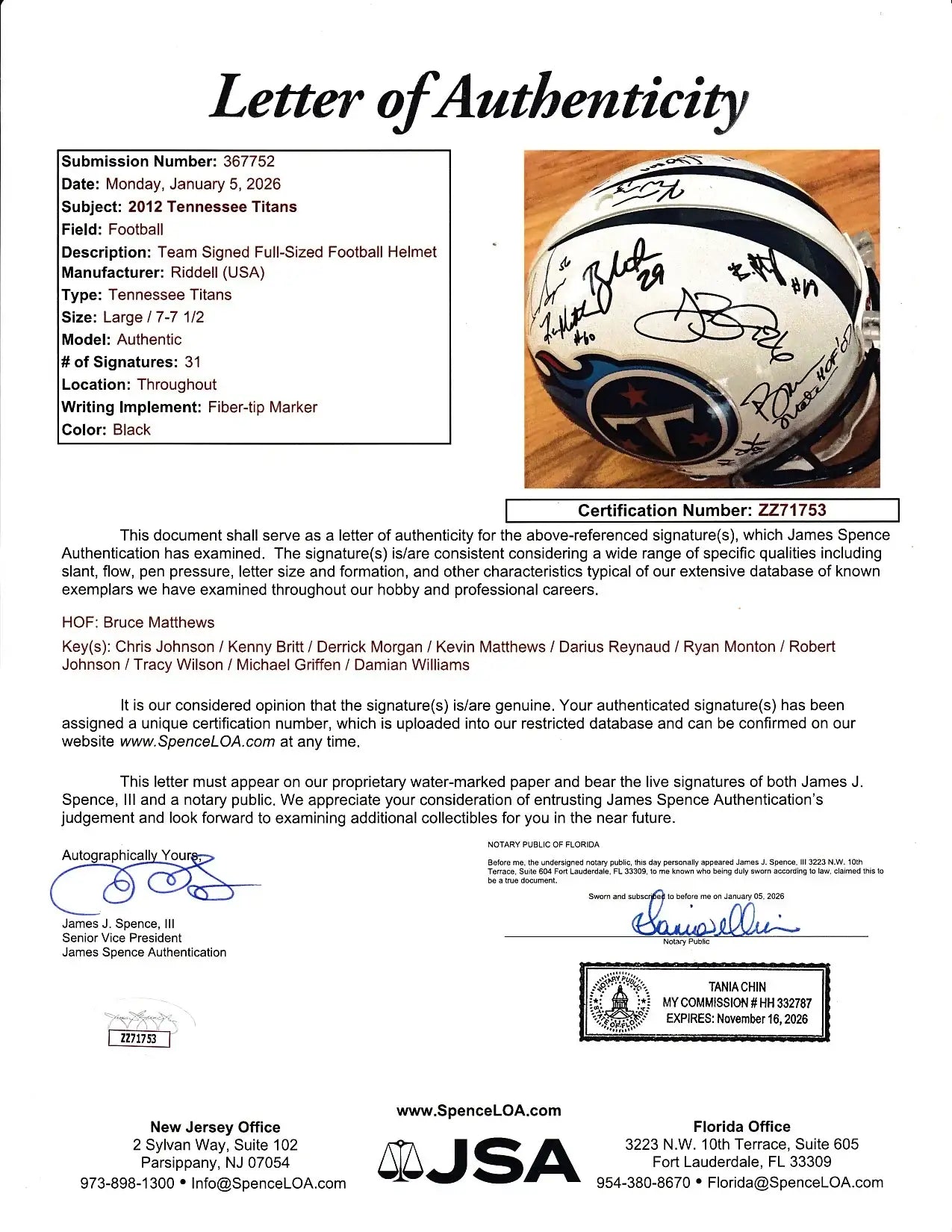 Tennessee Titans Riddell AUTHENTIC PRO LINE GAME MODEL HELMET autographed in black Sharpie by offensive line coach (and Hall of Famer) Bruce Matthews, plus 30 players from the 2012 team including superstar running back Chris Johnson, Kendall Wright, Damian Williams, Kenny Britt, Alterraun Verner, Jamie Harper, Coty Sensabaugh, Darius Reynaud, Jordan Babineaux, Ryan Mouton, Robert Johnson, Michael Griffin, Al Afalava, Quinn Johnson, Zac Diles, Zach Brown, Akeem Ayers, Kevin Matthews, Fernando Velasco, Leroy Harris, Mike Otto, Byron Stingily, Michael Roos, David Stewart, Lavelle Hawkins, Derrick Morgan, Mike Martin, Sen'Derrick Marks, DaJuan Harris and Jurrell Casey. Obtained in person at the team hotel in San Diego except Chris Johnson who was added at a paid signing. Authenticated by JSA with their matching numbered sticker on the helmet and Letter of Authenticity. ONLY ONE AVAILABLE FOR SALE.