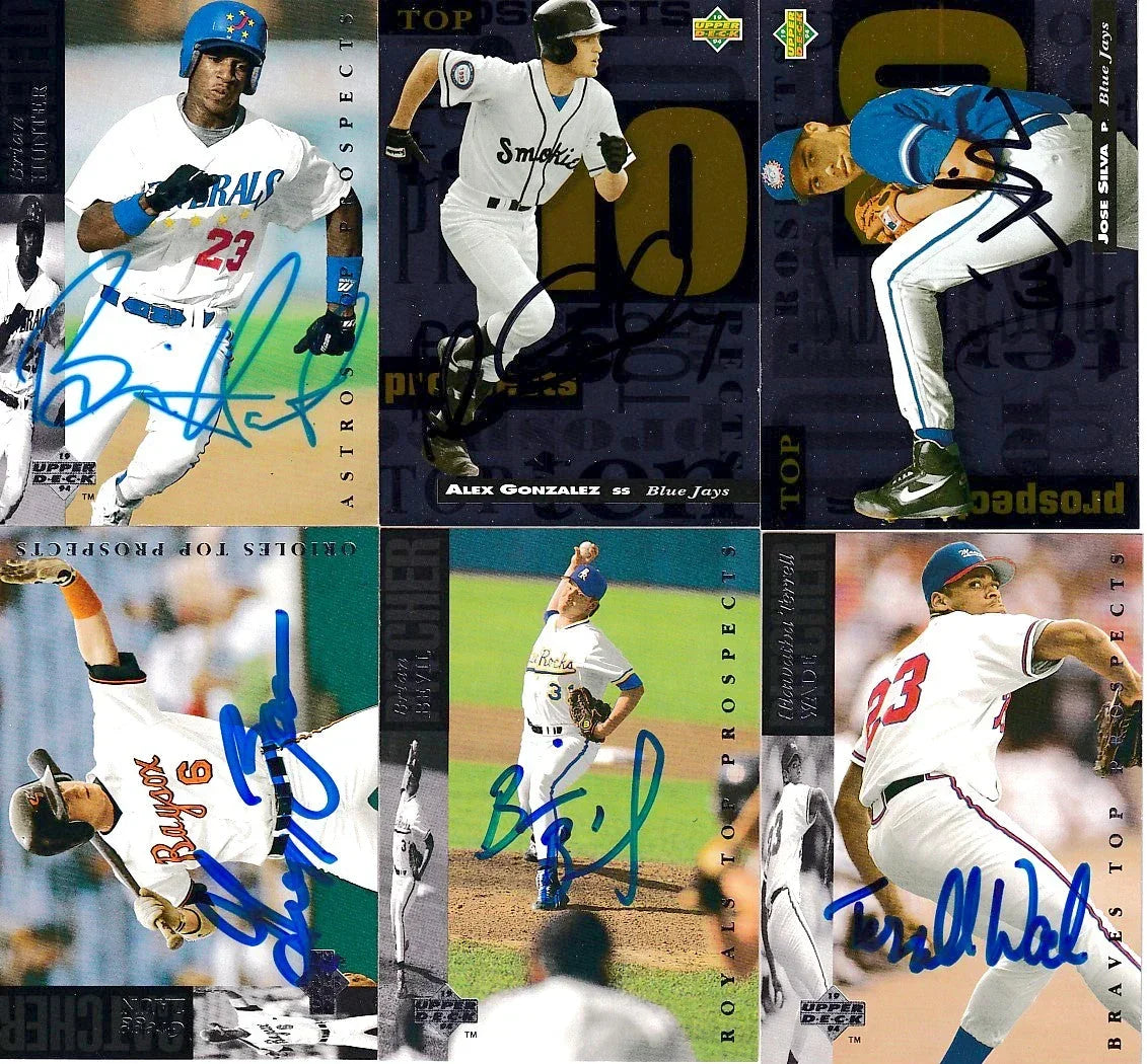 Lot of 6 1994 Upper Deck Minors baseball cards autographed in black or blue Sharpie including Brian Hunter, Terrell Wade, Brian Bevil, Gregg Zaun, Alex Gonzalez and Jose Silva (Top 10 Prospects inserts). All obtained in person. With certificate of authenticity from AutographsForSale.com. Average NrMt-Mt. ONLY ONE LOT AVAILABLE FOR SALE.