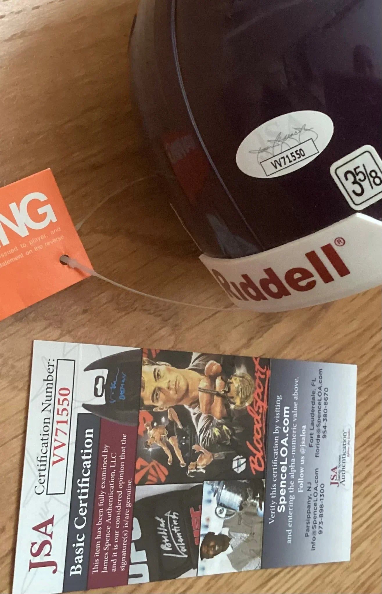 Minnesota Vikings mini helmet autographed in silver paint on the horn by former Pro Bowl wide receiver Ahmad Rashad. Obtained in person at the Bob Hope Chrysler Classic celebrity golf tournament many years ago. Authenticated by JSA with their matching numbered sticker on the helmet and certificate of authenticity card. ONLY ONE AVAILABLE FOR SALE.