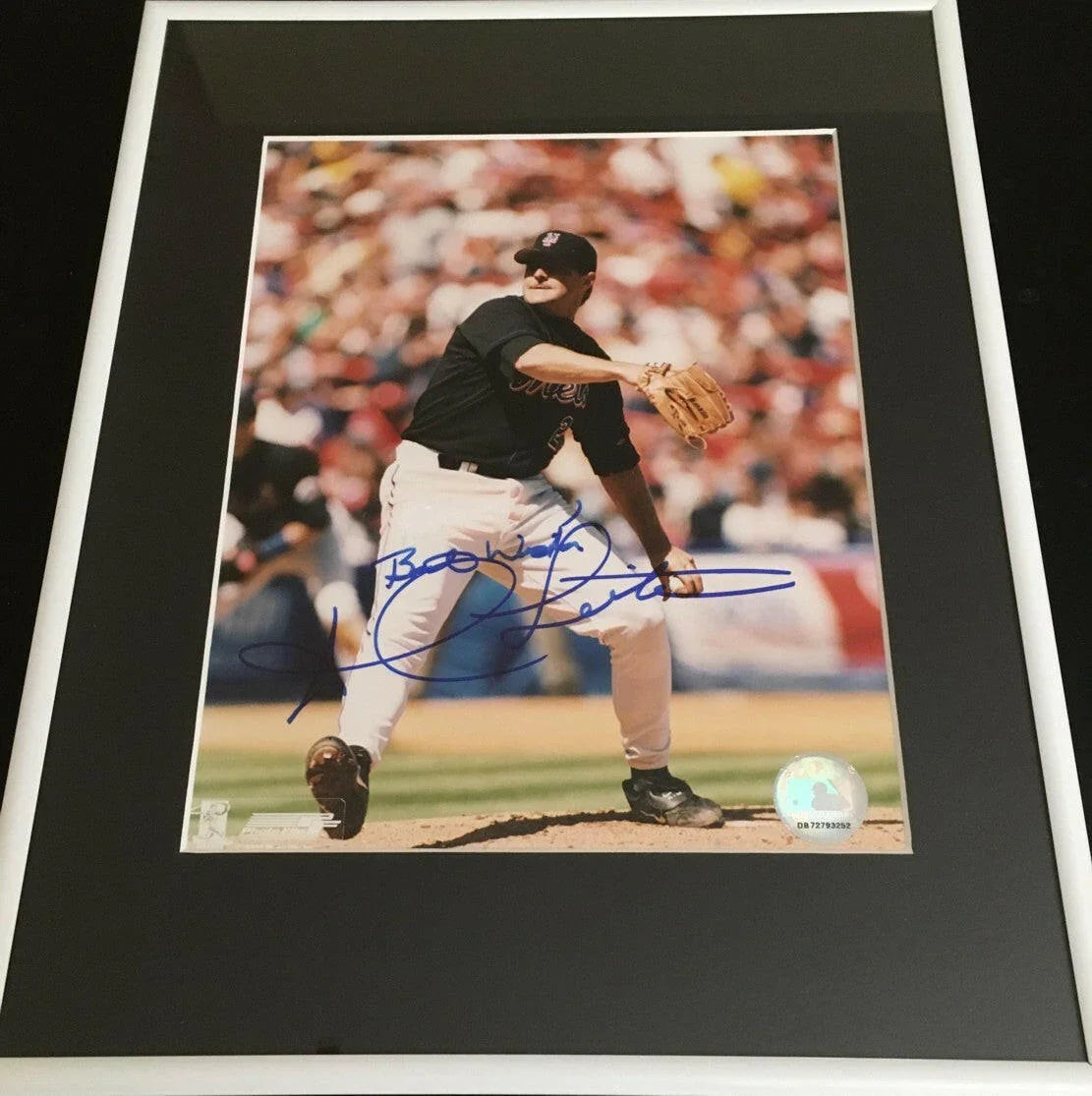 8x10 New York Mets action photo autographed in blue Sharpie by former ace pitcher Al Leiter (he added Best Wishes to his signature), matted in black and framed with glass in white metal to 11x14 inches, ready to hang. NOTE: there are very minor flaws above the signature noticeable only upon close inspection. Obtained in person. With certificate of authenticity from AutographsForSale.com. ONLY ONE AVAILABLE FOR SALE.