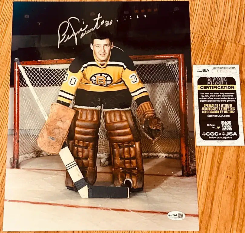 Boston Bruins 11x14 inch photo autographed in silver paint pen by the late, great goaltender Bernie Parent, who began his Hall of Fame career in Boston. Obtained from paid card show signing many years ago. Authenticated by JSA with their matching numbered sticker on the photo and certificate of authenticity card.