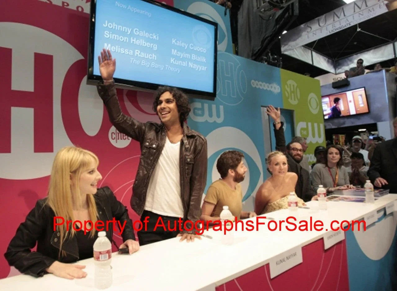 Big Bang Theory 11x17 inch poster autographed in silver by stars Kaley Cuoco, Johnny Galecki, Mayim Bialik, Melissa Rauch, Simon Helberg and Kunal Nayyar. Custom Matted and Framed with glass in black wood to 19 by 25 inches. Obtained in person at limited 2012 San Diego Comic-Con signing, with photo from the signing. Authenticated by JSA with their Letter of authenticity showing this poster. ONLY ONE AVAILABLE FOR SALE.