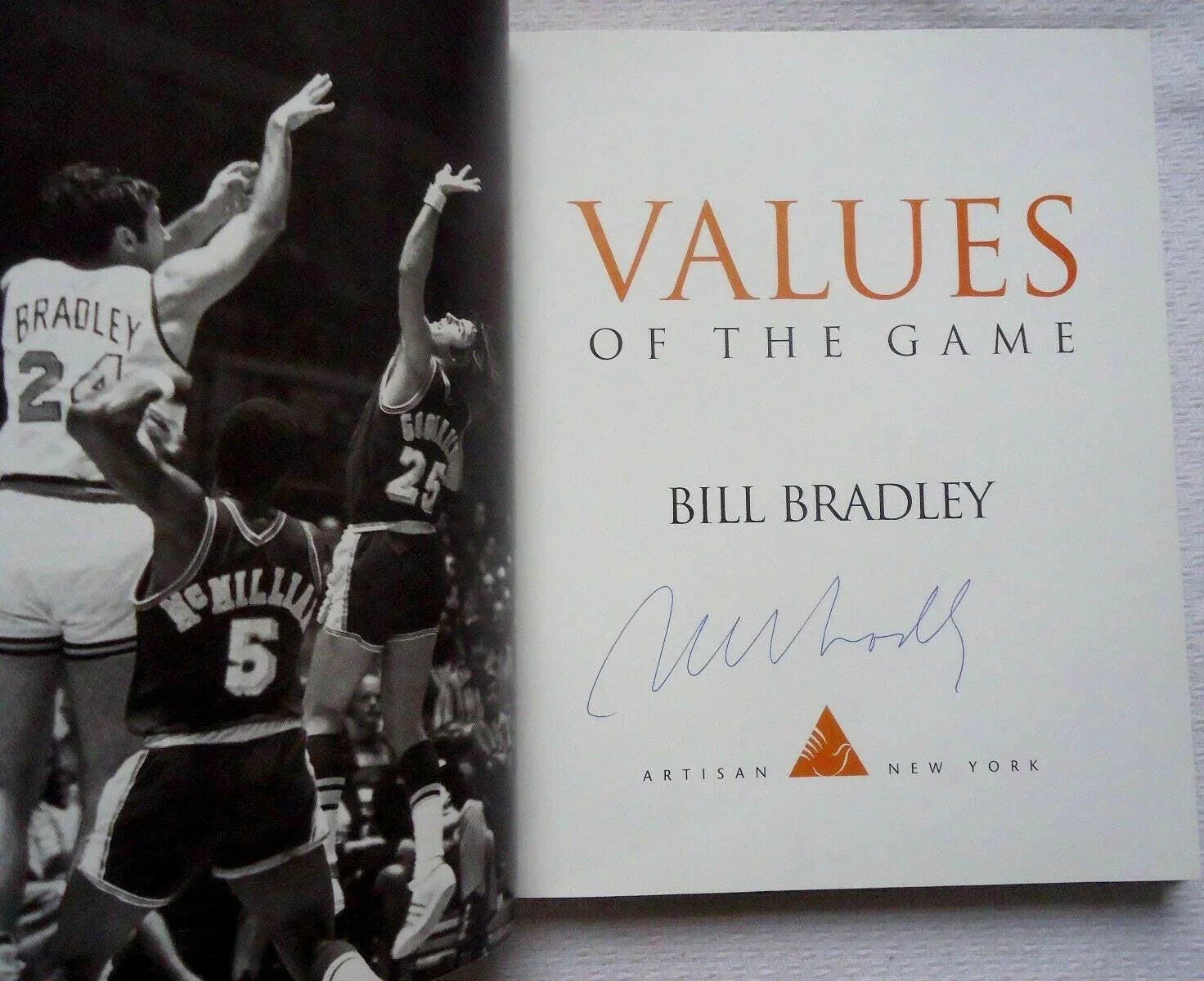 Values of the Game hardcover book autographed in blue ballpoint on the title page by author, Basketball Hall of Famer and former U.s. Senator Bill Bradley. Dust jacket has minor shelf wear. Obtained via book signing. With certificate of authenticity from AutographsForSale.com. ONLY ONE LEFT.