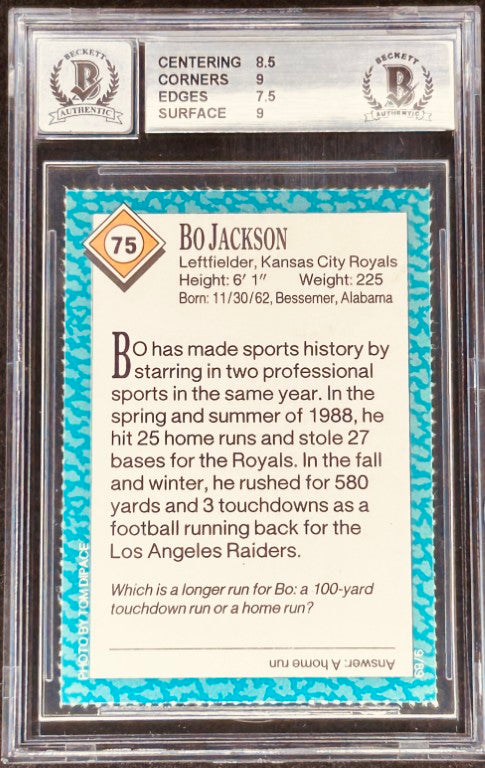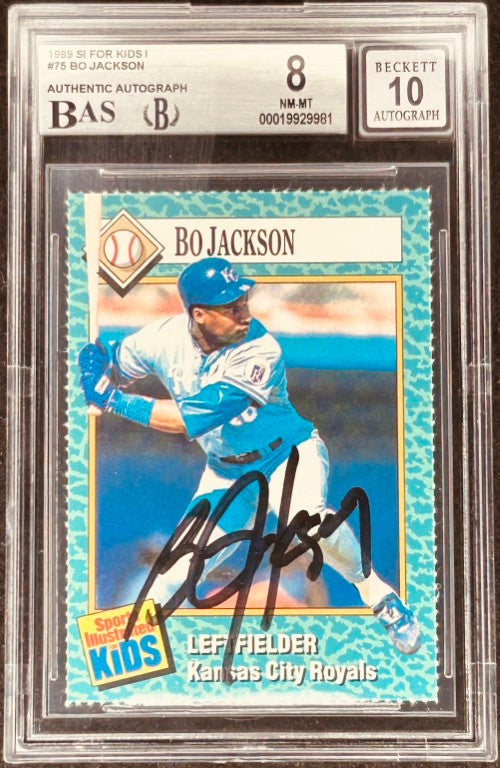 1989 Sports Illustrated for Kids card autographed in black Sharpie by Kansas City Royals legendary two-sport superstar Bo Jackson. Authenticated and slabbed by Beckett Authentication Services (BAS) with the autograph graded a perfect 10/10 and the card BGS graded 8 (NrMt-Mt). ONLY ONE AVAILABLE FOR SALE.