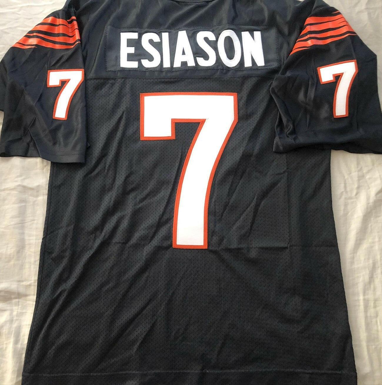 Rare Boomer Esiason Cincinnati Bengals black original authentic Starter early 1990s jersey with stitched-on double layer cloth tackle twill name and numbers. NOT autographed. Size 48 (about XL). The armpit corner to armpit corner measurement is about 23 inches. There are a few tiny areas on the sleeves with spots of excess orange printing but jersey otherwise appears new and free of any defects. NOTE: As shown on ESPN Outside the Lines, the vast majority of NFL jerseys sold on the internet are cheap counterfeits made in Asia with vinyl numbers made to look like cloth. This is a REAL Starter jersey stitched in the United States. ONLY ONE AVAILABLE FOR SALE.