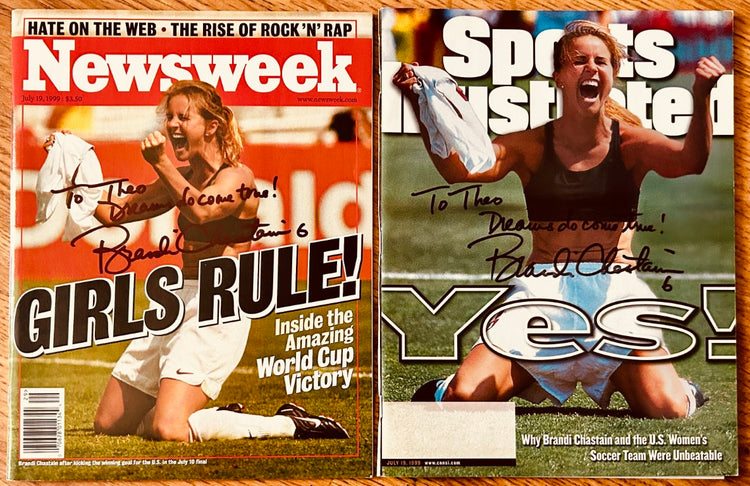 Set of 2 complete Newsweek and Sports Illustrated magazines featuring Brandi Chastain celebrating after winning the 1999 Women’s World Cup with her penalty kick, both autographed in black Sharpie and inscribed Dream do come true! Obtained in person, with certificate of authenticity from AutographsForSale.com. ONLY ONE SET AVAILABLE FOR SALE.
