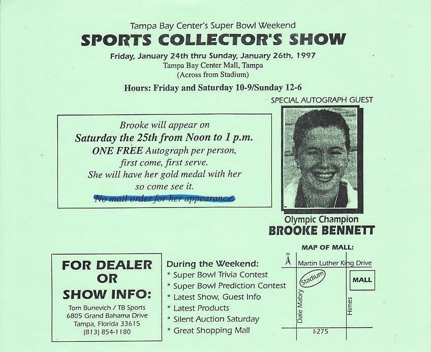 1996 React newsprint magazine COVER ONLY autographed in blue ballpoint by Olympic swimmer Brooke Bennett, who went on to win three individual freestyle swimming gold medals (one in 1996, two in 2000). Obtained in person at 1997 appearance in Tampa, with flyer from the appearance and certificate of authenticity from AutographsForSale.com. NOTE: has vertical crease running down through the a in React. ONLY ONE AVAILABLE FOR SALE.