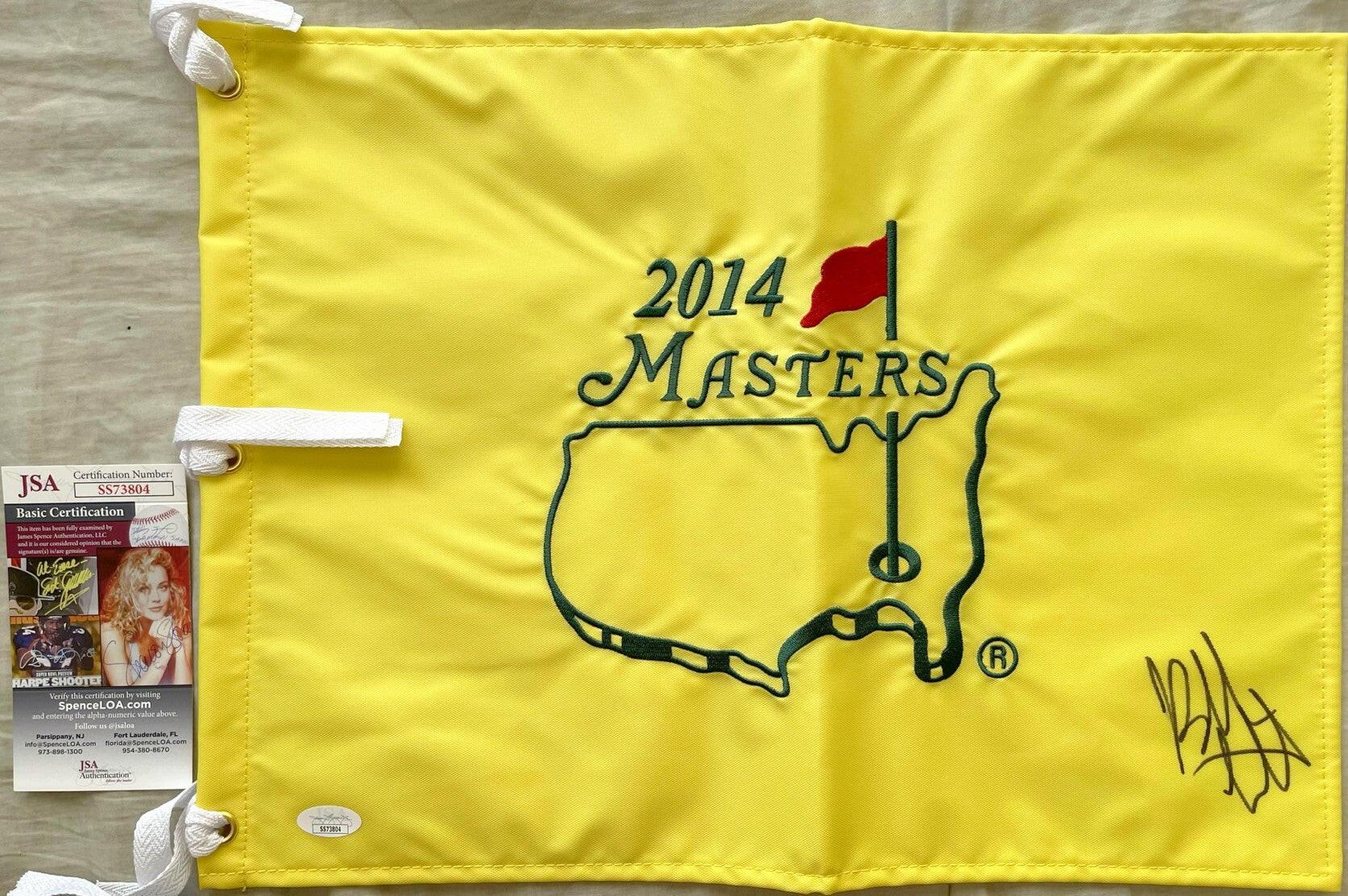 2014 Masters golf pin flag autographed in black Sharpie to the right of the map by winner Bubba Watson (he will not sign in the middle). Obtained in person at Southern California PGA Tour event. Authenticated by JSA with their matching numbered sticker on the flag and certificate of authenticity card. ONLY ONE LEFT.