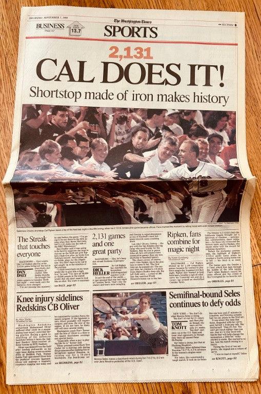 Complete Sept 6 and Sept 7 1995 Washington Times newspaper sports sections featuring Baltimore Orioles legend Cal Ripken tying and breaking Lou Gehrig’s Consecutive Games Iron Man record with games 2130 and 2131, PLUS Sept 6 Commemorative special section. All 3 sections with typical age yellowing but no significant flaws. ONLY ONE SET AVAILABLE FOR SALE.