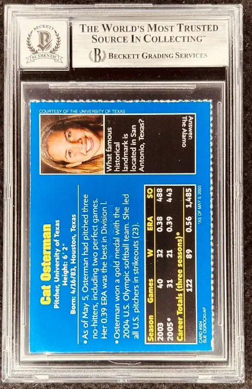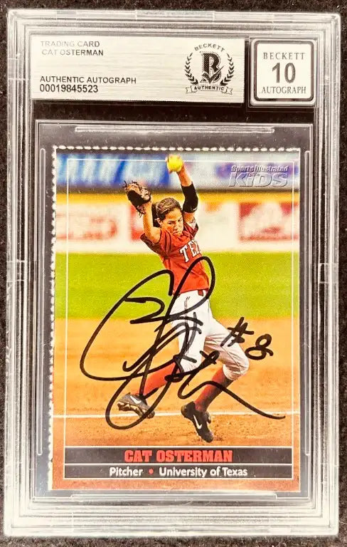 Cat Osterman Texas Longhorns 2005 Sports Illustrated for Kids softball Rookie Card autographed in black Sharpie and she added her jersey number 8. Authenticated and slabbed by Beckett Authentication Services (BAS) with the autograph graded a perfect 10 out of 10. Card grades about ExMt (centering, rough bottom left edge). ONLY ONE AVAILABLE FOR SALE.