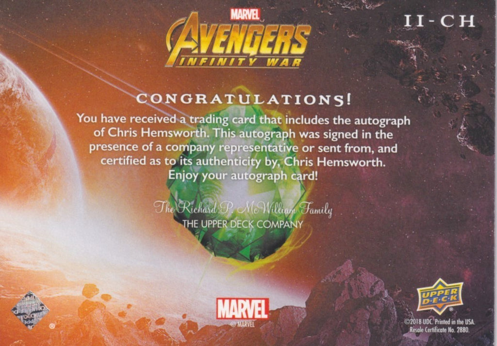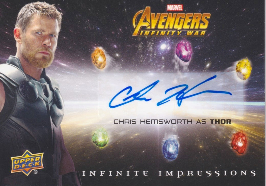Marvel Avengers Infinity War movie 2018 Upper Deck Infinite Impressions certified autograph card of actor Chris Hemsworth as Thor, card #II-CH. NrMt or better condition. ONLY ONE AVAILABLE FOR SALE.