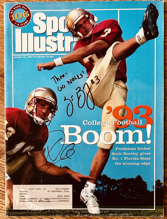 Complete 1993 Sports Illustrated magazine autographed in black Sharpie by Florida State Seminoles kicker Scott Bentley (inscribed Theo GO NOLES!) and quarterback Danny Kanell. Obtained in person, with certificate of authenticity from AutographsForSale.com. In excellent condition with only minor flaws and wear. ONLY ONE AVAILABLE FOR SALE.