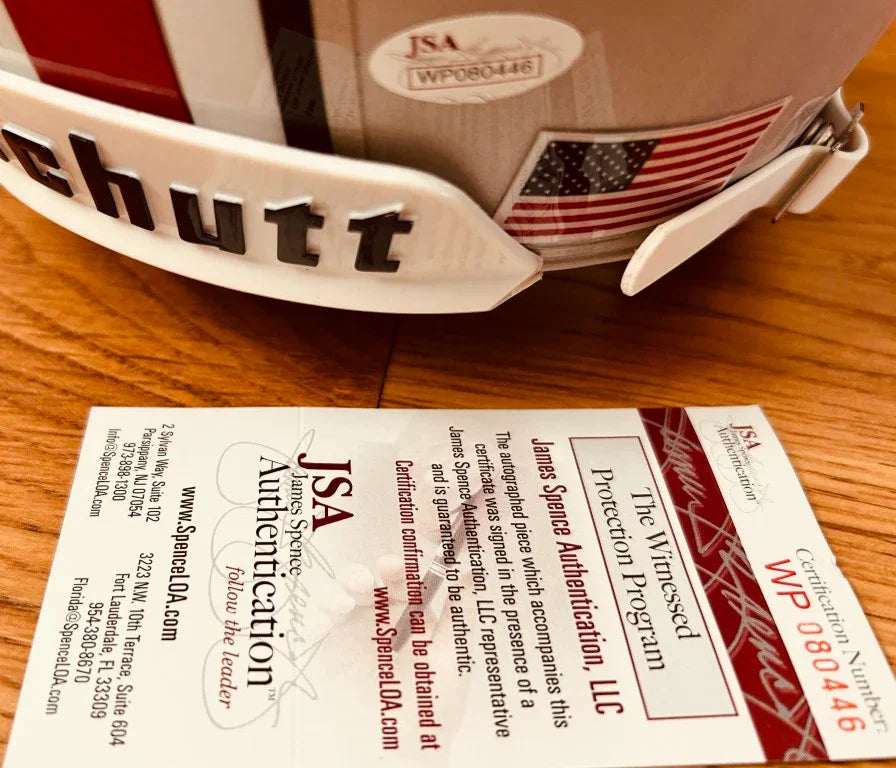 Ohio State Buckeyes Schutt full size replica helmet autographed in black Sharpie by Heisman Trophy winning running back Eddie George and inscribed HT 95. From a paid signing witnessed by JSA, with their matching numbered sticker on the helmet and certificate of authenticity card. ONLY ONE AVAILABLE FOR SALE.