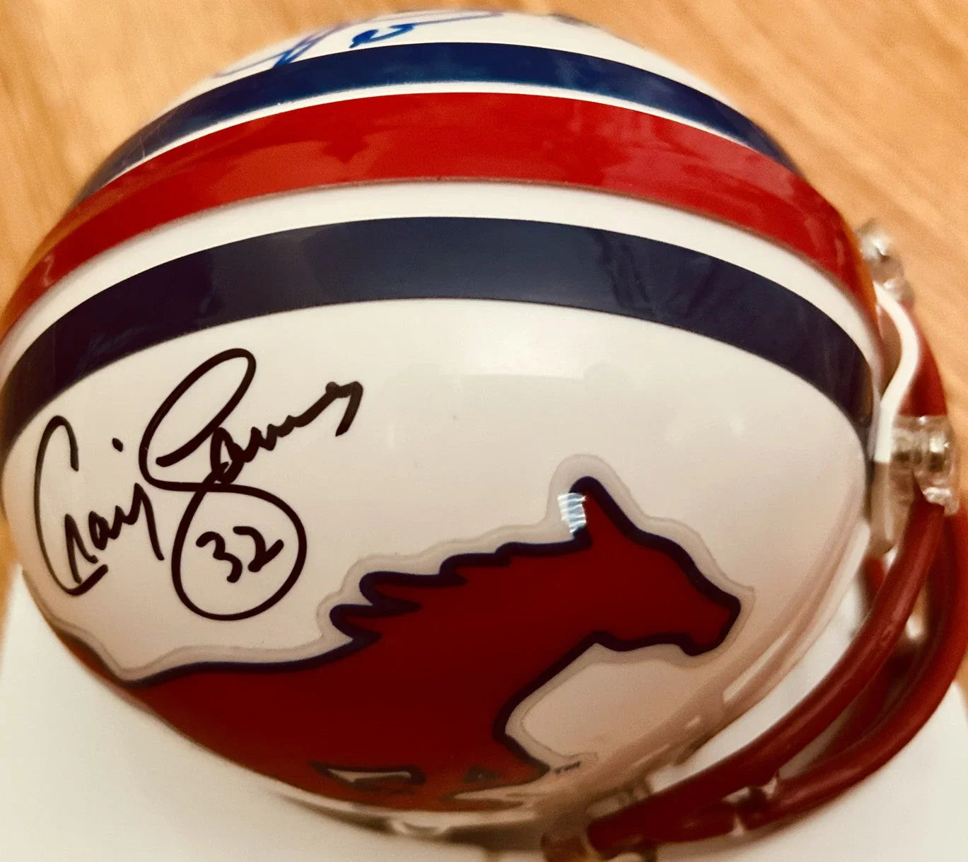 SMU Mustangs Riddell mini helmet autographed in blue and black Sharpie on opposite sides by former Pony Express superstar running backs Eric Dickerson and Craig James, and Dickerson added Pony Express to his signature on the decal. Authenticated by JSA with their matching numbered sticker and certificate of authenticity card. ONLY ONE LEFT.