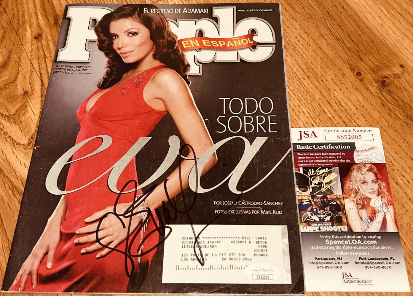 Complete People En Espanol magazine autographed on the cover in black Sharpie by sexy actress Eva Longoria of Desperate Housewives fame. Has minor handling flaws and wear, still suitable for framing. Authenticated by JSA with their matching numbered sticker on the cover and certificate of authenticity card. ONLY ONE AVAILABLE FOR SALE.