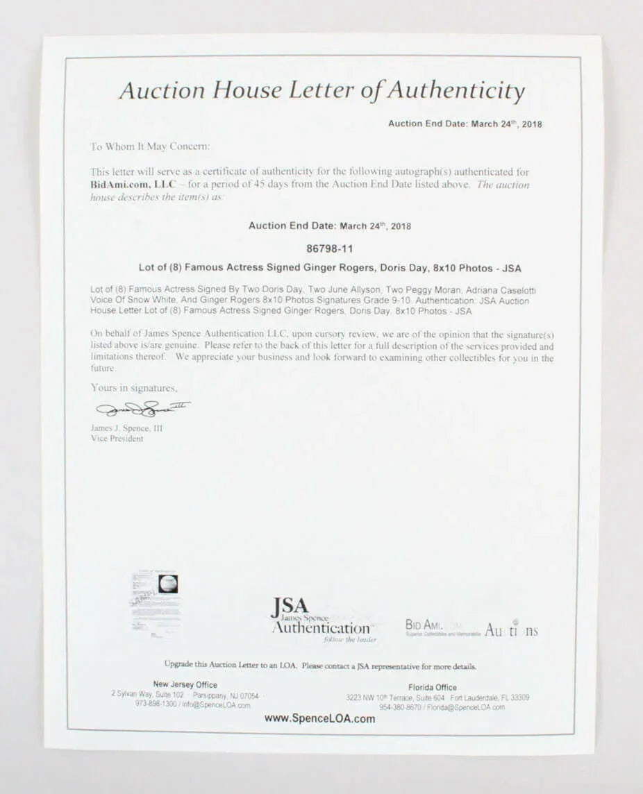 8x10 black and white photo autographed and inscribed Blessings from Ginger Rogers by the late, legendary actress in thin black Sharpie (slightly faded). PHOTO HAS MINOR TO MODERATE FLAWS and WEAR. With JSA Auction Letter of authenticity listing this and other autographed items. ONLY ONE AVAILABLE FOR SALE.