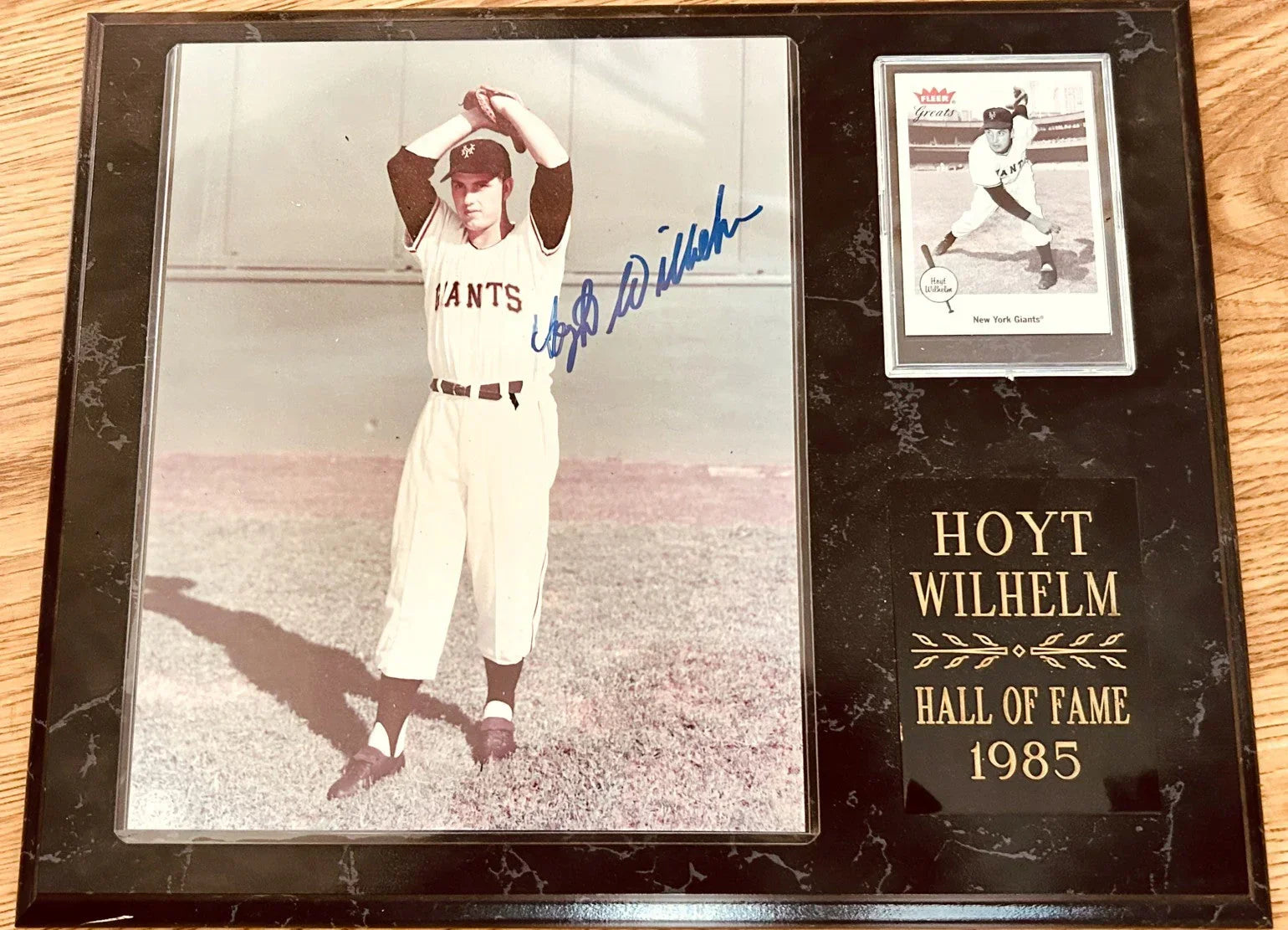 New York Giants 8x10 photo autographed in blue Sharpie by the late Hall of Fame pitcher Hoyt Wilhelm, mounted on a black marble finish plaque with 2002 Fleer Greats of the Game baseball card and engraved nameplate. Plaque has very minor flaws. With certificate of authenticity from AutographsForSale.com. ONLY ONE AVAILABLE FOR SALE.