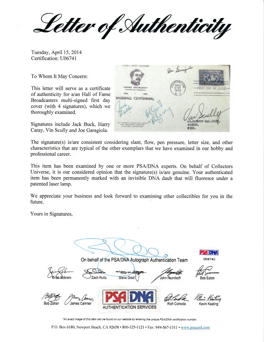 2014 Leaf Executive Collection Masterpiece authentic cut signature card of the late, legendary St. Louis Cardinals broadcaster Jack Buck (died 2002). This is a unique 1/1 card that is authenticated by JSA and slabbed by Beckett Grading Services. Will come with a COPY of the original JSA Letter of authenticity as original LOA was already sent with the other Leaf Cut 1/1 card it was made from.