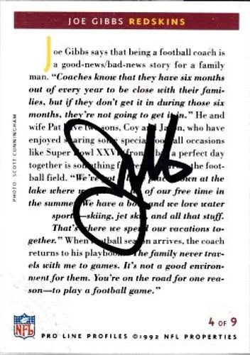 Joe Gibbs certified autograph Washington Redskins 1992 Pro Line card - AutographsForSale.com