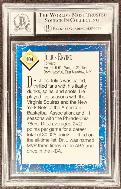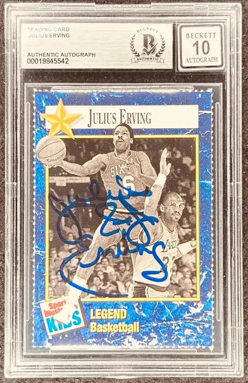 1992 Sports Illustrated for Kids Legend basketball card of Philadelphia 76ers Hall of Famer Julius (Dr. J) Erving autographed beautifully in blue Sharpie with a full name signature. Authenticated and slabbed by Beckett Authentication Services (BAS) with the autograph graded a perfect 10 out of 10. ONLY ONE AVAILABLE FOR SALE.