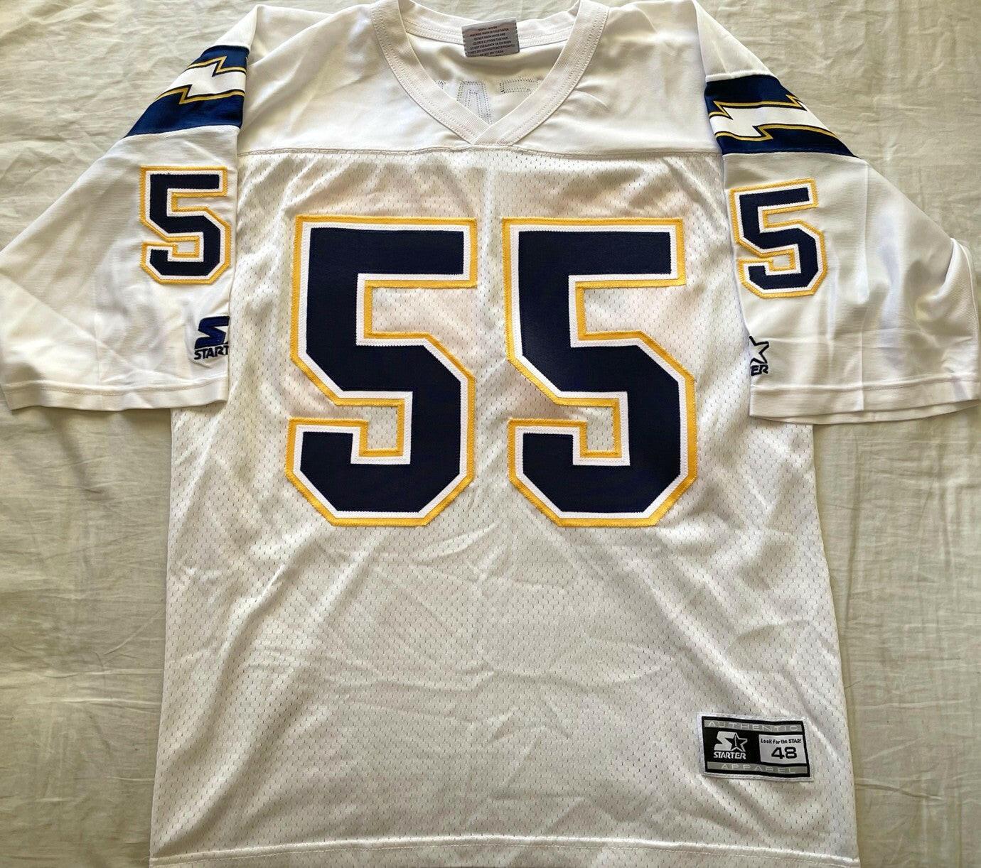Rare Junior Seau San Diego Chargers original late 1990s authentic Starter road white size 48 (XL) jersey with stitched-on double layer cloth tackle twill name and numbers. The shoulder lightning bolts are screened. The armpit corner to armpit corner measurement is about 24 inches, top of back collar to bottom front is about 29 inches. EXCELLENT Used CONDITION with NO MAJOR FLAWS (due to age, it’s not quite as white as it once was). NOTE: As shown on ESPN Outside the Lines, the vast majority of NFL jerseys sold on the internet are cheap counterfeits made in Asia with vinyl numbers made to look like cloth. This is a REAL Reebok jersey stitched in the United States. ONLY ONE AVAILABLE FOR SALE.