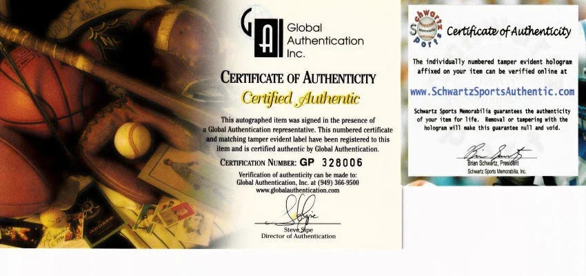 16x20 inch poster size photo of Magic Johnson and Larry Bird jockeying for rebound position under the basket, autographed by both Basketball Hall of Famers in blue Sharpie. From separate paid signings authenticated by Global Authentics (Magic) and Schwartz sports (Bird), respectively, with their numbered stickers on the photo and certificate of authenticity cards.