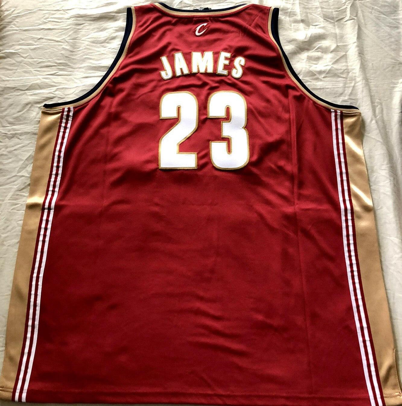 Rare LeBron James Cleveland Cavaliers authentic Adidas road red ROOKIE SEASON size 60 (about 4XL) game model jersey with stitched-on double layer cloth tackle twill name and numbers. This is the exact style LeBron wore during his 2003-04 rookie season in the NBA except for size. NOT BOOTLEG, NOT SWINGMAN. BRAND NEW, NEVER WORN (paper tags included but not attached). NOT autographed.