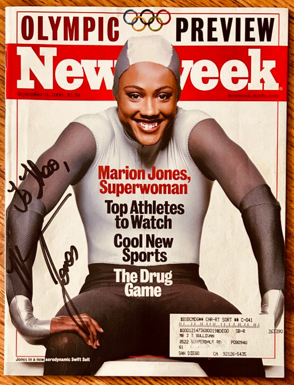 Complete 2000 Newsweek Sydney Olympics magazine autographed in black Sharpie by track star Marion Jones and personalized To Theo. Obtained in person. With certificate of authenticity from AutographsForSale.com. Magazine has subscription address plus minor flaws and wear. ONLY ONE AVAILABLE FOR SALE.