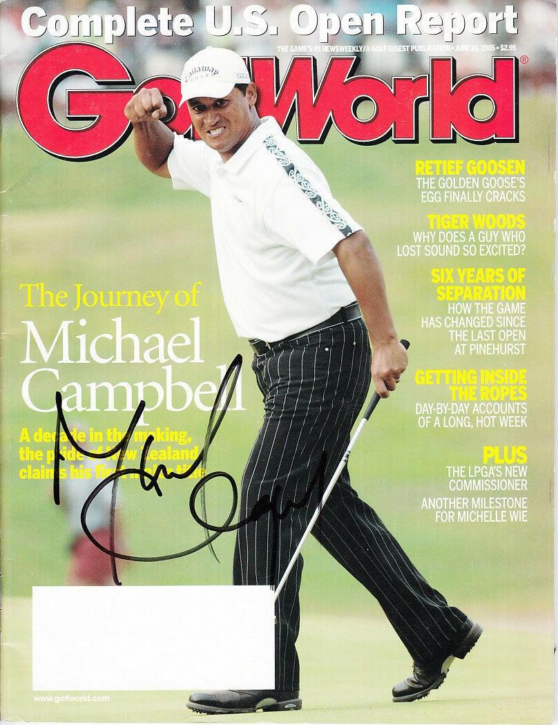 Complete Golf World magazine commemorating Michael Campbell’s dramatic 2005 US Open win, autographed on the cover in black Sharpie. Obtained in person. With certificate of authenticity from AutographsForSale.com. ONLY ONE LEFT.