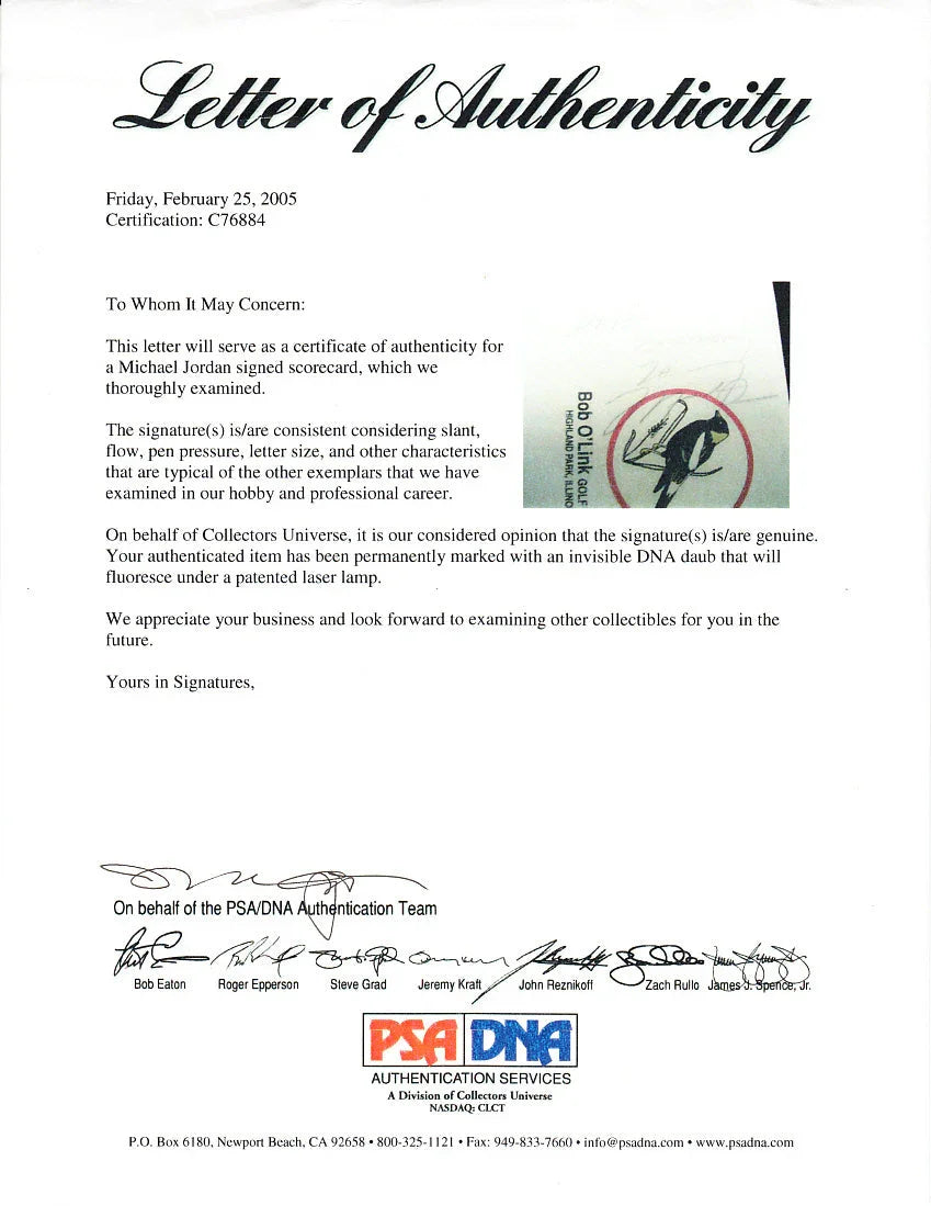 - PSA/DNA Letter of authenticity - specifically for Michael Jordan’s signature