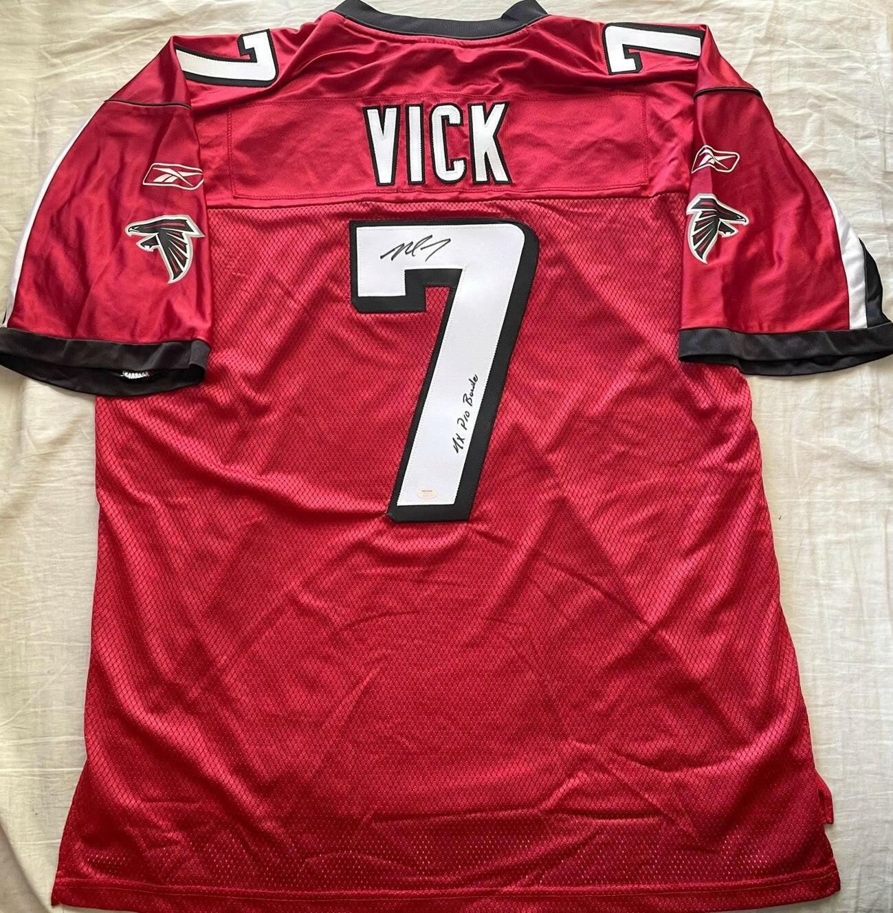 Rare Michael Vick Atlanta Falcons red authentic Reebok NFL Equipment size XL jersey (2003 to 2006 style from the prime of his career) with stitched-on double layer cloth tackle twill name (on nameplate) and numbers, screen printed Falcons logos on the sleeves, autographed in black Sharpie on the back 7 and inscribed 4X Pro Bowler. From a paid signing with Schwartz sports, with their numbered hologram sticker on the number and certificate of authenticity card. NOTE: the black vertical seam to the right of the nameplate was repaired with inner stitching. ONLY ONE AVAILABLE FOR SALE.