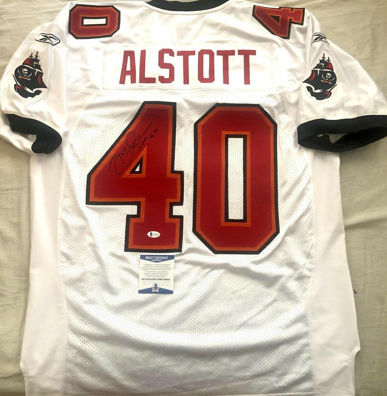 Mike Alstott Tampa Bay Buccaneers 2002 authentic Reebok white game model triple layer tackle twill stitched jersey autographed by Alstott in black Sharpie on the back 4. From a paid private signing witnessed by Beckett Authentication Services (BAS) with their matching numbered sticker on the jersey and certificate of authenticity card. NEW. ONLY 1-2 OF EACH SIZE AVAILABLE FOR SALE.