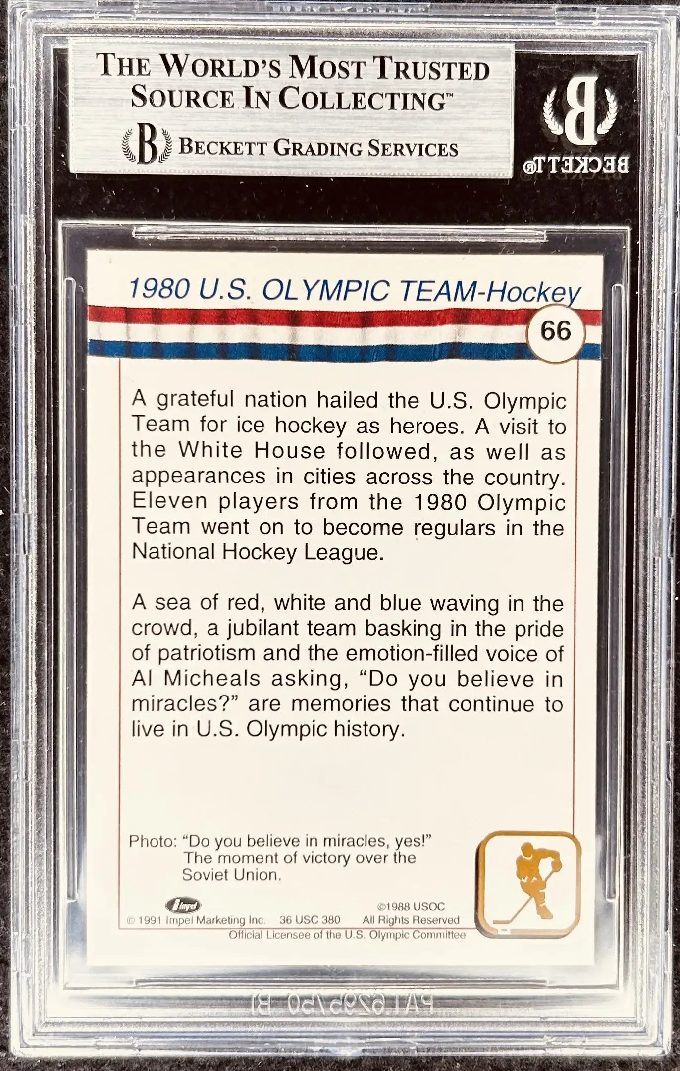 1991 Impel US Olympic Hall of Fame card featuring the 1980 Miracle on Ice US Olympic Hockey Team celebration, autographed in blue Sharpie by team captain Mike Eruzione. Authenticated and slabbed by Beckett Authentication Services (BAS). NrMt-Mt or better. SIGNATURE WILL VARY SLIGHTLY AS WE HAVE MORE THAN ONE IN STOCK.