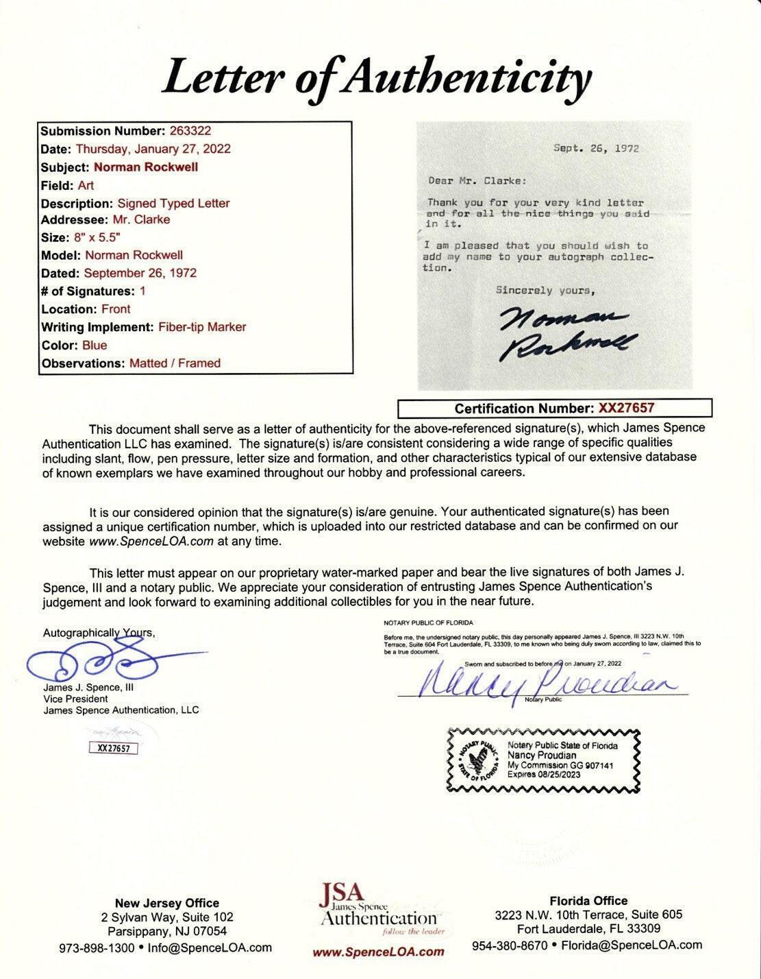 Norman Rockwell original 1972 letter on his personal letterhead autographed in blue Sharpie by the late, legendary artist, professionally matted in gold with an 8x10 print of his famous triple self-portrait, framed with glass in white, ready to hang. Authenticated by JSA with their Letter of authenticity showing the signature. The original 1972 postmarked envelope sent from Rockwell is included also. Framed size is roughly 16 by 20 inches. ONLY ONE AVAILABLE FOR SALE.