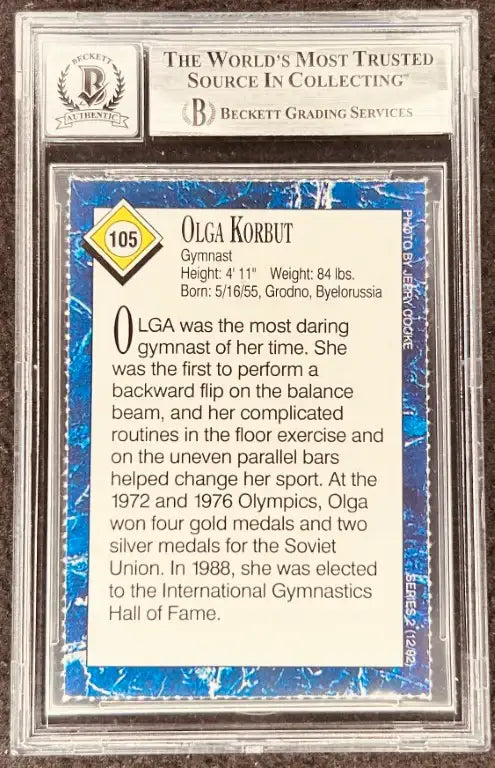 Olga Korbut 1992 Sports Illustrated for Kids Legend card autographed beautifully in thin blue Sharpie by legendary 4-time Olympic gold medal winning gymnast Olga Korbut. Authenticated and slabbed by Beckett Authentication Services (BAS) with the autograph graded 8. Card grades about NrMt. ONLY ONE AVAILABLE FOR SALE.