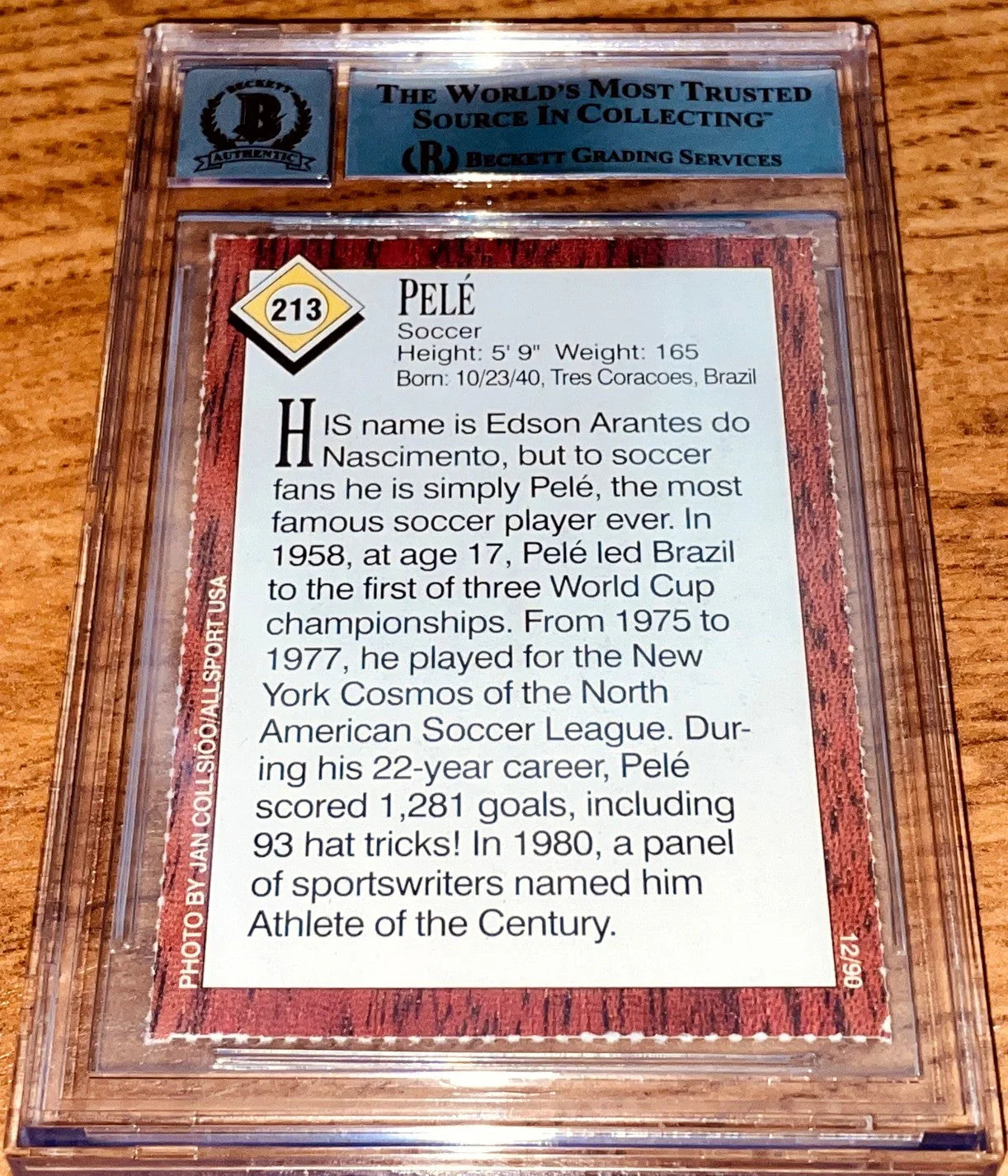 1990 Sports Illustrated for Kids Legends card autographed beautifully in black Sharpie by late, great Brazilian soccer superstar Pele. Obtained in person. Authenticated and slabbed by Beckett Authentication Services (BAS) with the autograph graded a perfect 10. Has typical perforations. ONLY ONE AVAILABLE FOR SALE.