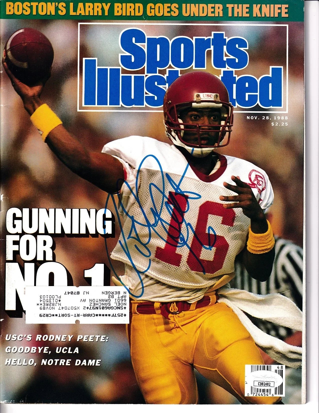 Complete 1988 Sports Illustrated magazine autographed in blue Sharpie on the cover by former USC All-American quarterback Rodney Peete, who led the Trojans to consecutive Rose Bowl appearances. Authenticated by JSA with their matching numbered sticker on the cover and certificate of authenticity card. Has subscription label plus minor flaws and wear. ONLY ONE IN THIS CONDITION AVAILABLE FOR SALE.