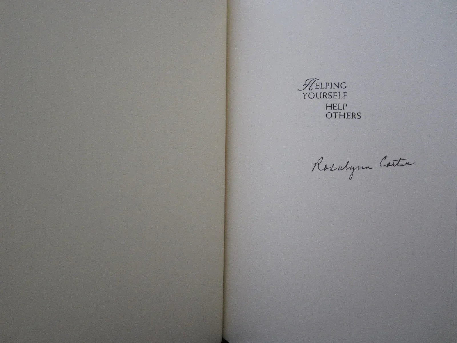 Helping Yourself Help Others (a Book for Caregivers) hardcover book autographed on the title page by author and former First Lady Rosalynn Carter. Obtained from book signing, with certificate of authenticity from AutographsForSale.com. Dust jacket has minor shelf wear. ONLY ONE AVAILABLE FOR SALE.