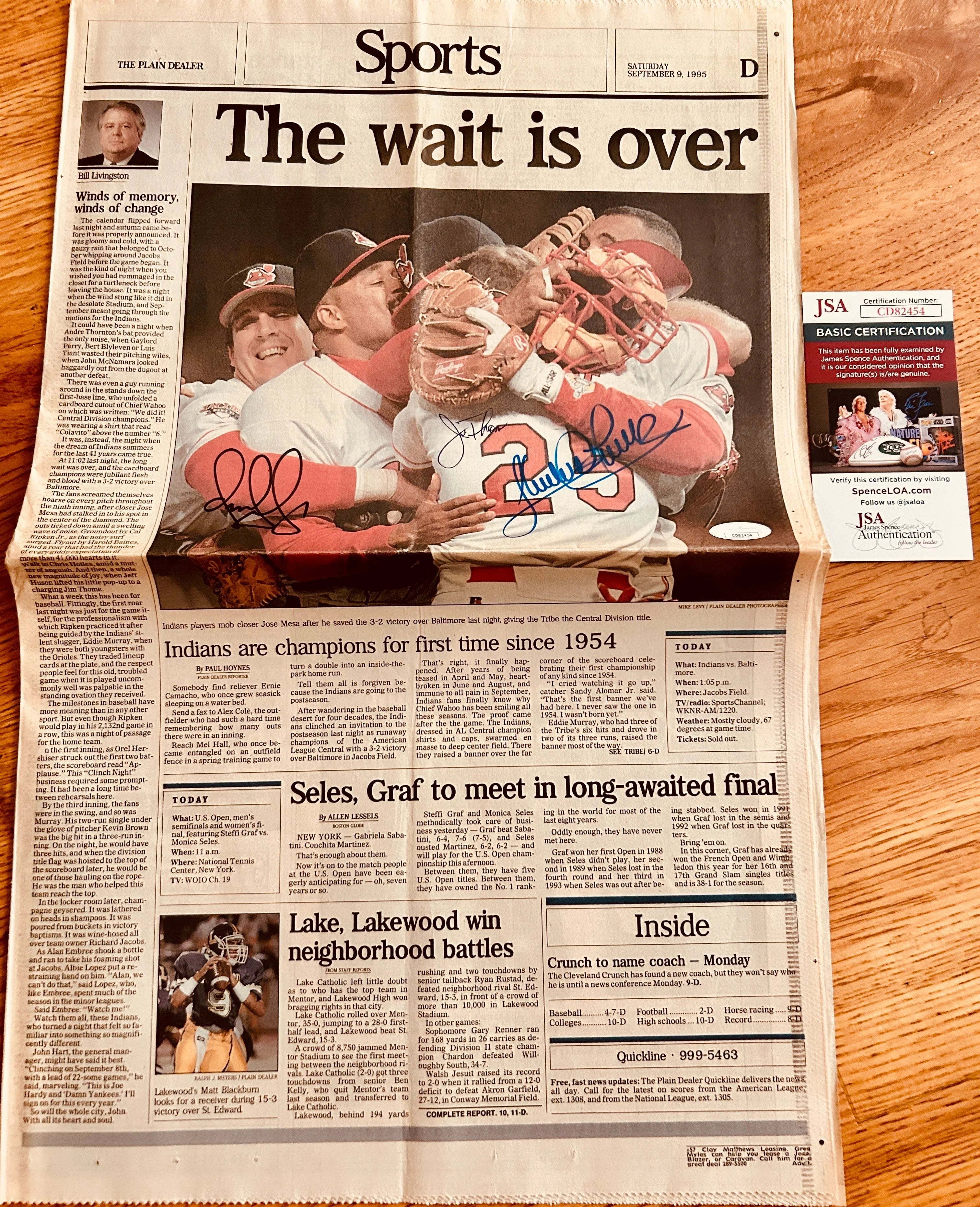 Complete original September 9, 1995 Cleveland Plain Dealer newspaper sports section commemorating the Indians clinching the AL Central Division title autographed in black or blue Sharpie by stars Sandy Alomar Jr, Jim Thome and Omar Vizquel. Authenticated by JSA with their matching numbered sticker on the newspaper and certificate of authenticity card. Has typical age yellowing but otherwise in superb condition with no creases or tears. ONLY ONE AVAILABLE FOR SALE.