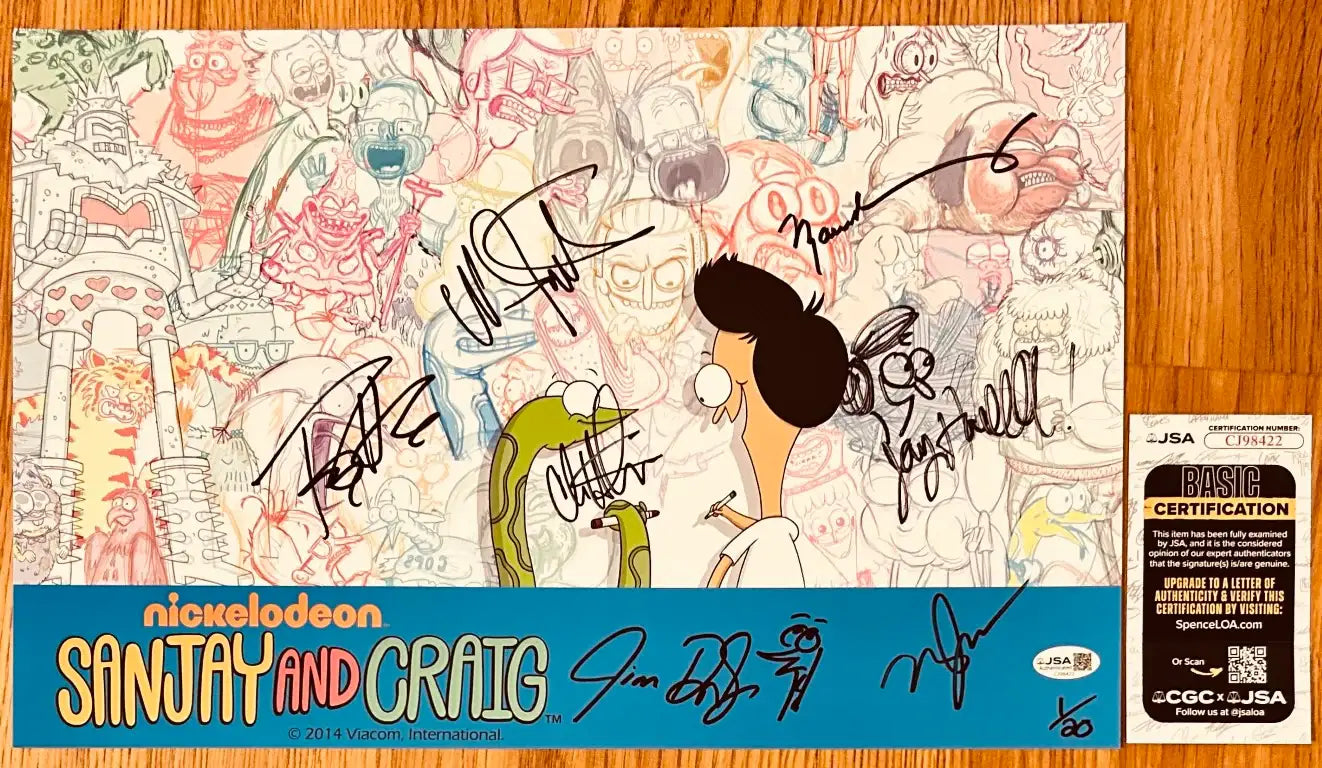 Roughly 11 by 17 inch mini poster for the hit TV Show Sanjay and Craig autographed in black Sharpie by co-creators Jay Howell and Jim Dirschberger (both added doodles to their signatures), plus voice stars Chris Hardwick, Maulik Pancholy, Tony Hale, Matt Jones and Nika Futterman. Obtained in person at very limited 2014 San Diego Comic-Con signing except Hardwick who was added in 2015. With photo from the signing, original autograph tickets from the 2014 cast and 2015 Hardwick signings. Authenticated by JSA with their matching numbered sticker on the poster and certificate of authenticity card. ONLY ONE LEFT.