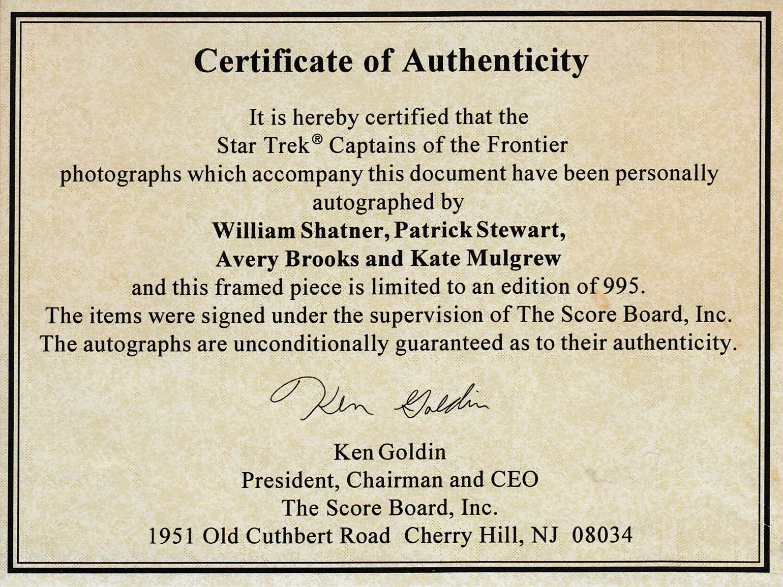 Star Trek 5x7 photos autographed in silver paint by the actors who starred as the four Captains (William Shatner, Patrick Stewart, Avery Brooks and Kate Mulgrew) matted in gray with Heroes of the Frontier metallic nameplate, framed with plexiglas in a 16x20 black metal frame, ready to hang. The 4 individual photos are matted to about 4 1/2 by 6 1/2 inches. From a numbered limited edition of 995. From a paid signing with Score Board, with their certificate of authenticity. ONLY ONE LEFT.
