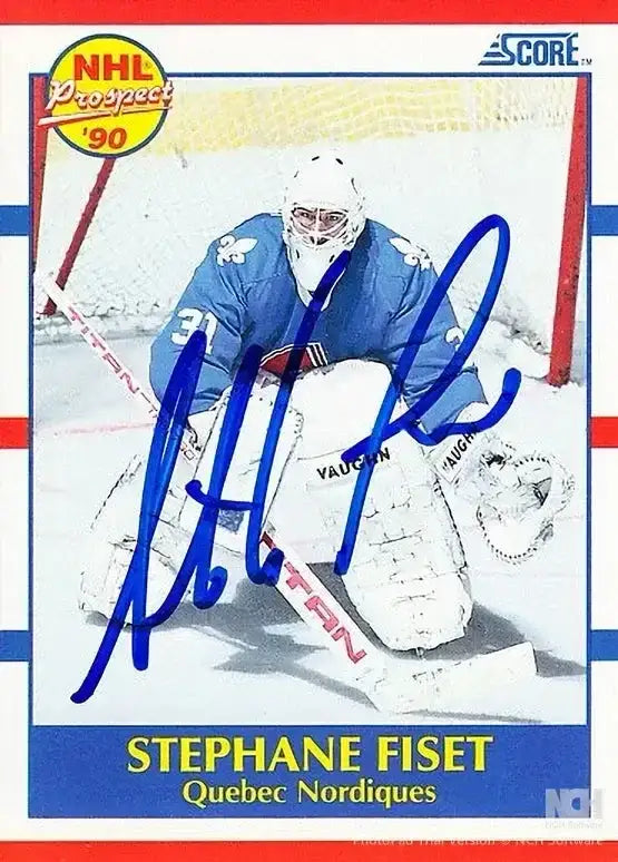 1990-91 Score Rookie Card autographed in blue Sharpie by former Quebec Nordiques goalie Stephane Fiset. Obtained in person, with certificate of authenticity from AutographsForSale.com. ONLY ONE AVAILABLE FOR SALE.
