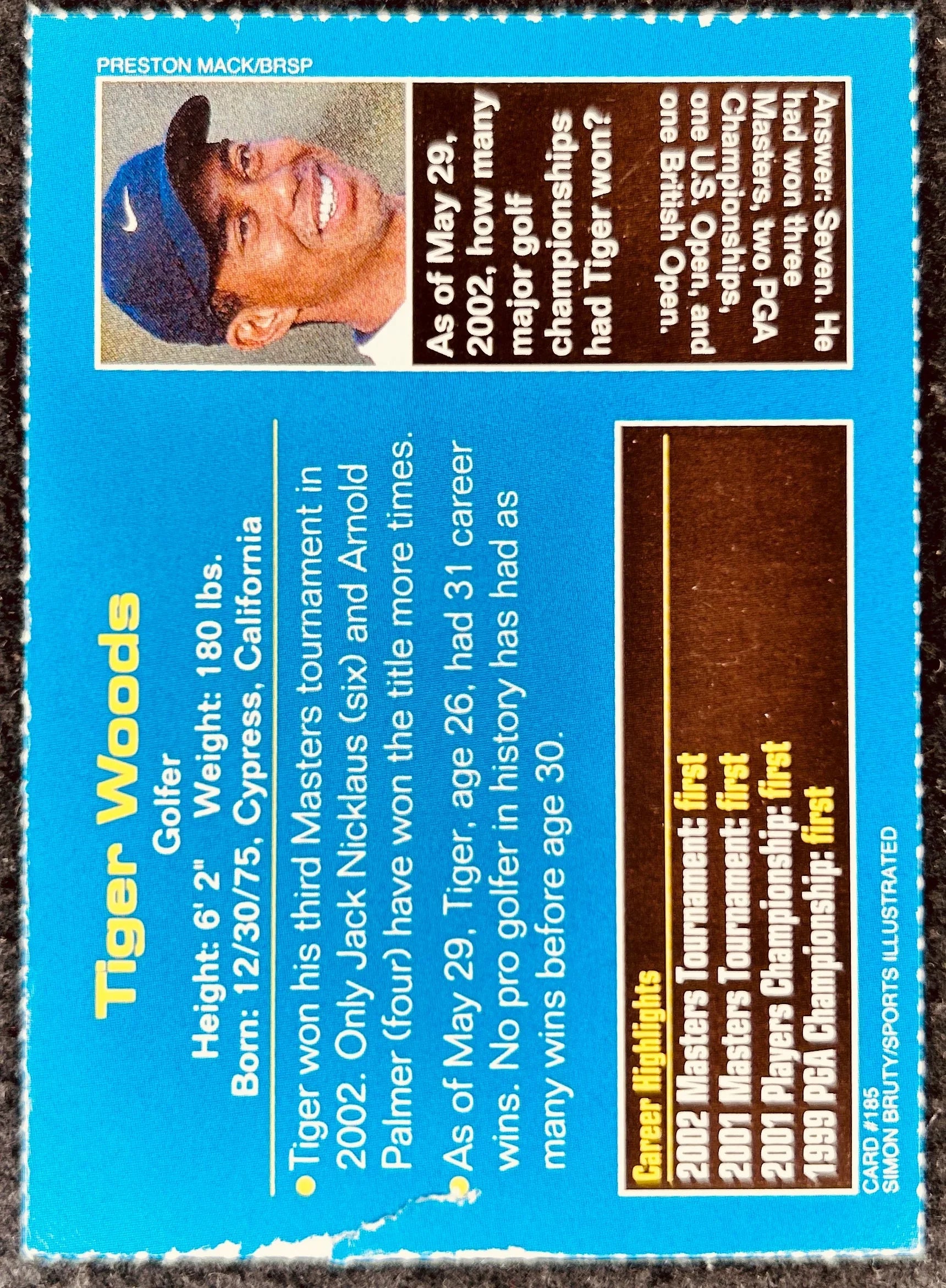 - Features a genuine 2002 Sports Illustrated for Kids Tiger Woods golf card