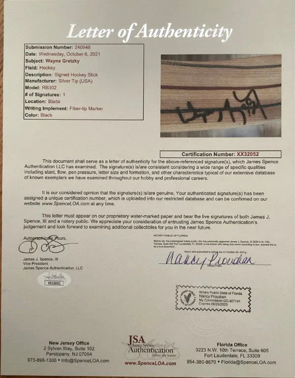 Wayne Gretzky Easton aluminum Silver Tip mid 1990s personal game model hockey stick autographed on the blade in thick black Sharpie by the legendary Great One. Authenticated by JSA with their Letter of authenticity showing the signature. This stick is NOT game Used and the blade is Easton model RB302 (NOT Gretzky’s personal model). ONLY ONE AVAILABLE FOR SALE.