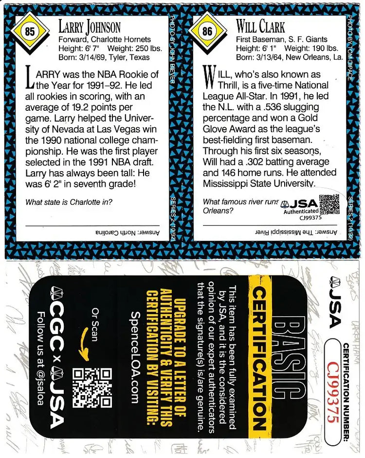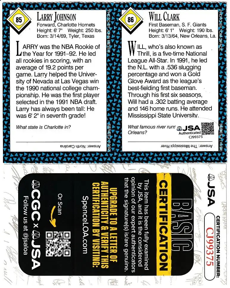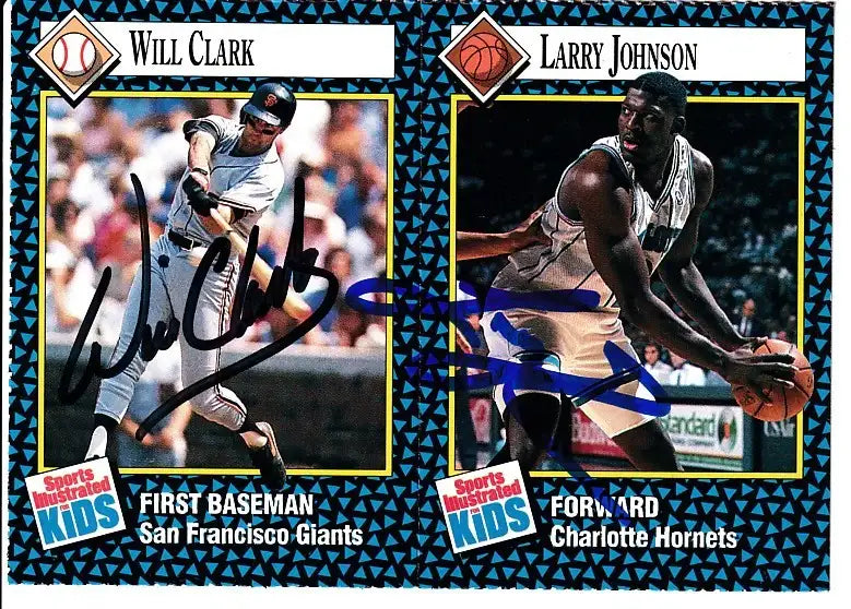 1992 Sports Illustrated for Kids perforated 2 card panel featuring San Francisco Giants slugger Will Clark and Charlotte Hornets star Larry Johnson autographed by both in black and blue Sharpie, respectively. Johnson signed slightly over Clark's card. Authenticated by JSA with their matching numbered sticker on the back of the panel and certificate of authenticity card. About NrMt condition.